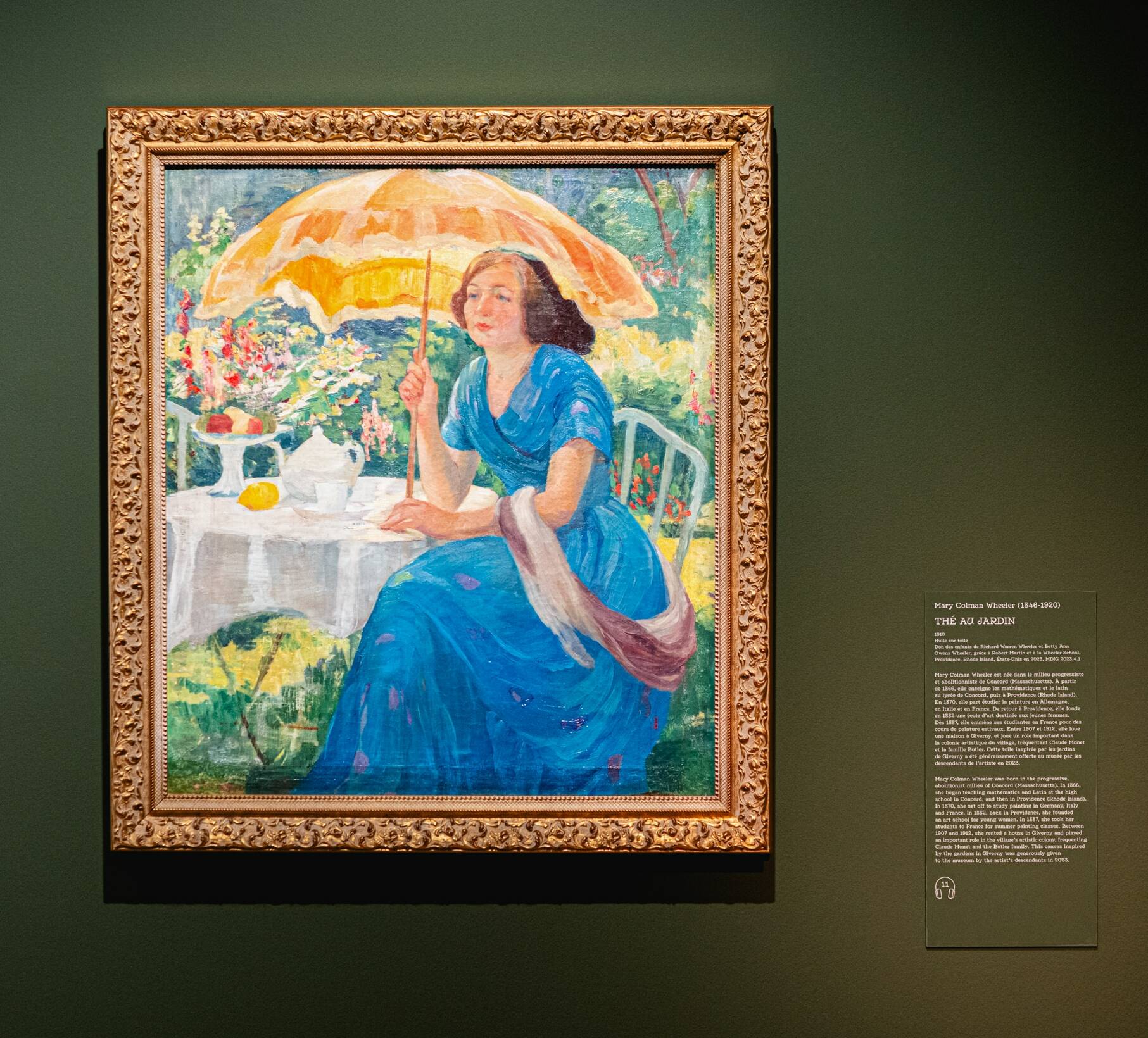 Peintre mais aussi professeure de peinture, Mary Colman Wheeler, issue d’un milieu progressiste, fonde en 1889 une école pour jeunes femmes à Providence, dans le Rhode Island. Chaque été, elle emmène ses élèves en France pour y étudier la langue et l’art. Son style évolue alors vers l’impressionnisme, un phénomène renforcé par sa fréquentation de Giverny, où elle séjourne avec sa classe pour leur apprendre la peinture sur le motif. Là, professeure et étudiantes se mêlent à la colonie et fréquentent même certains membres de la famille Monet. En effet, la Wheeler School loue la maison voisine de celle de l’impressionniste, Le Hameau (où a également séjourné Lilla Cabot Perry), dont on distingue le jardin fleuri dans Thé au jardin.