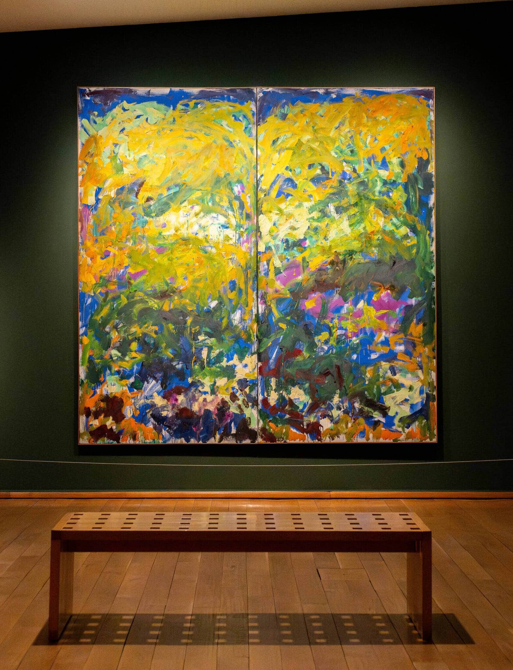 Aux États-Unis, Joan Mitchell se fait une place parmi les grands noms de l’art abstrait, aux côtés de Jackson Pollock, Mark Rothko, ainsi que ses homologues féminins Elaine de Kooning, Helen Frankenthaler ou Lee Krasner. Mitchell développe une peinture gestuelle, caractérisée par l’intensité de sa palette et la vibration de ses touches. Sans repère figuratif, la présence de son œuvre La Grande Vallée IX dans l’exposition Les Collections au jardin, au musée des impressionnismes Giverny, pourrait surprendre. Pourtant, elle s’inscrit parfaitement dans la collection : son travail illustre l’héritage des œuvres tardives de Monet et leur influence sur les peintres de l’expressionnisme abstrait.
